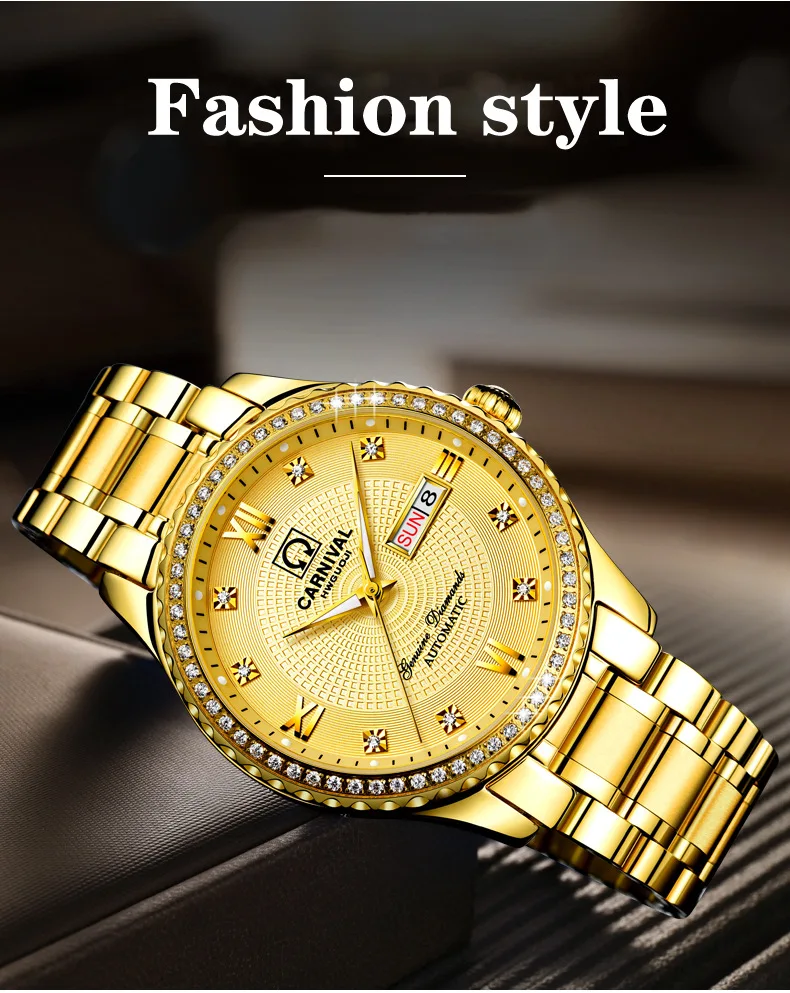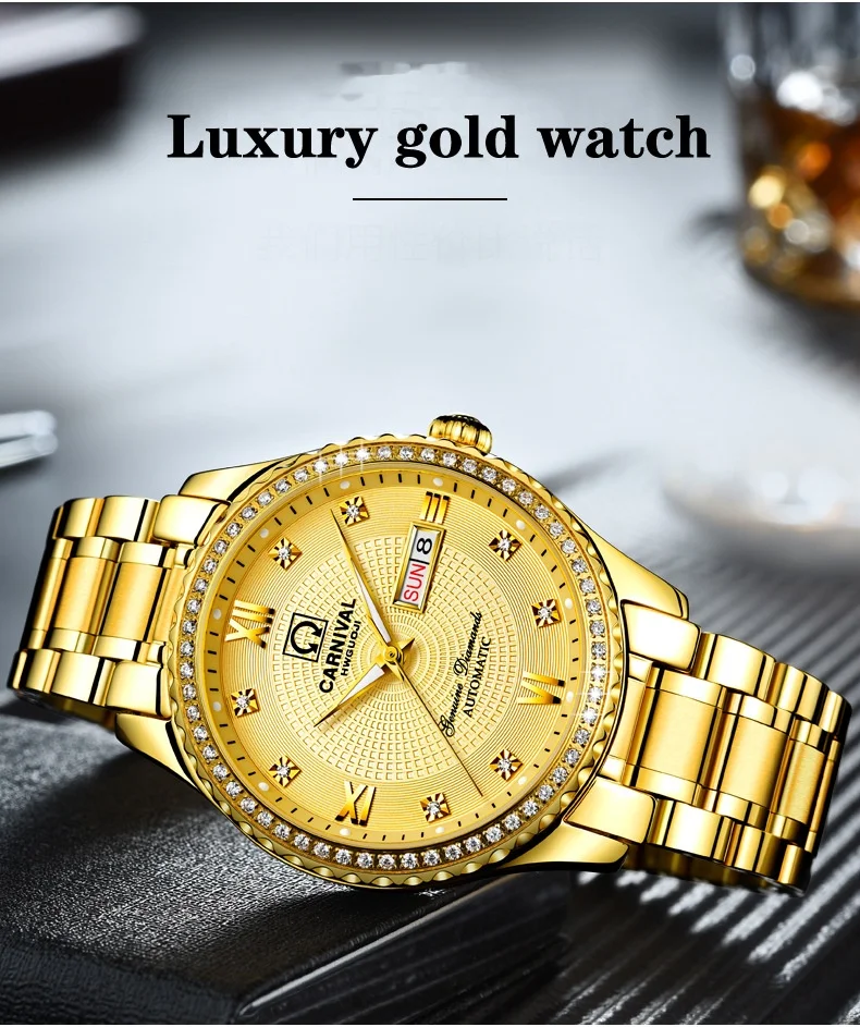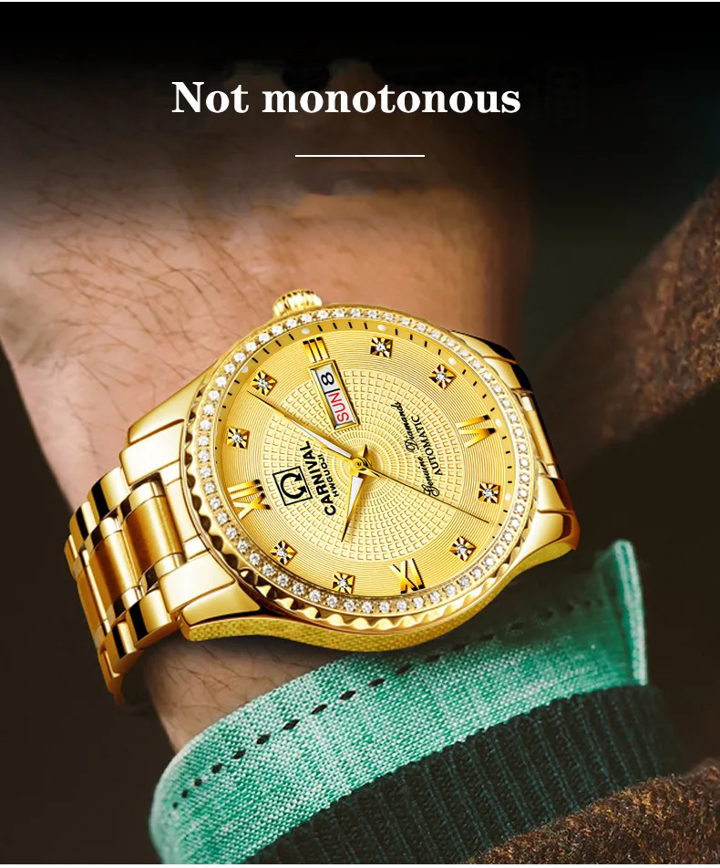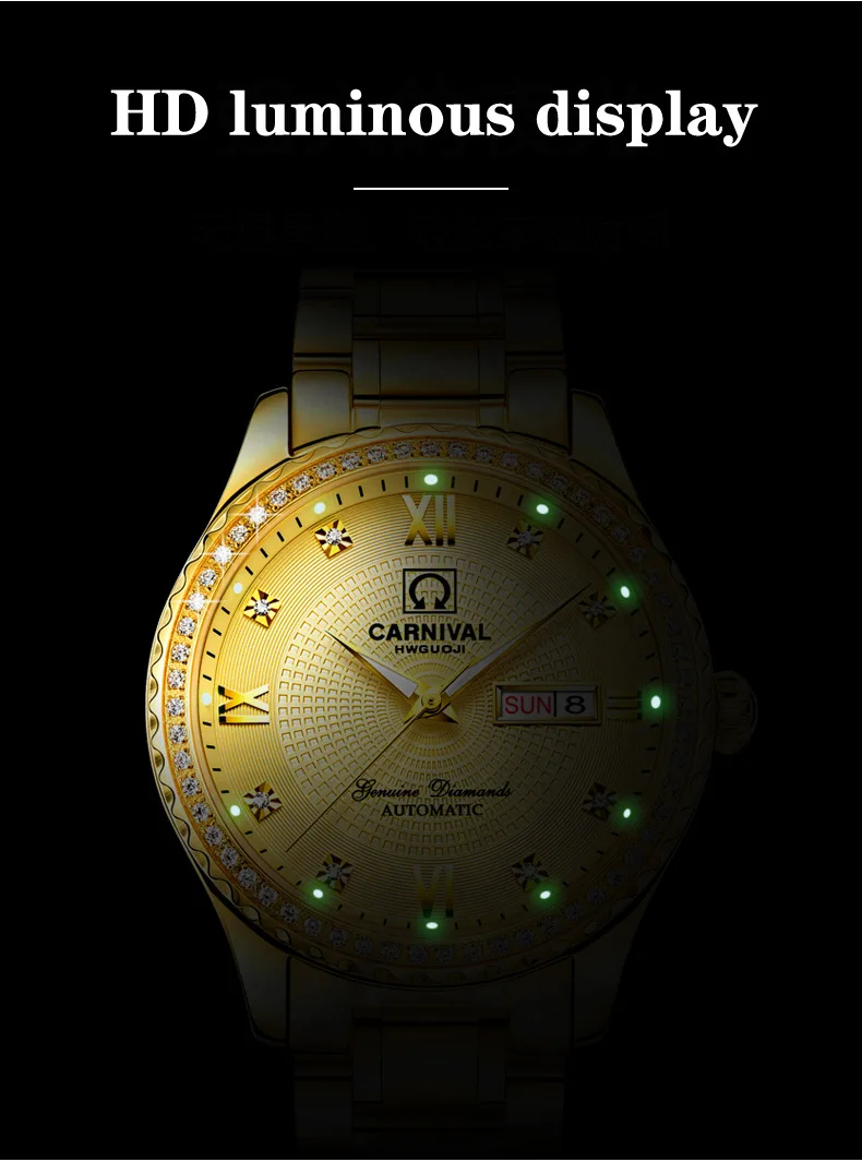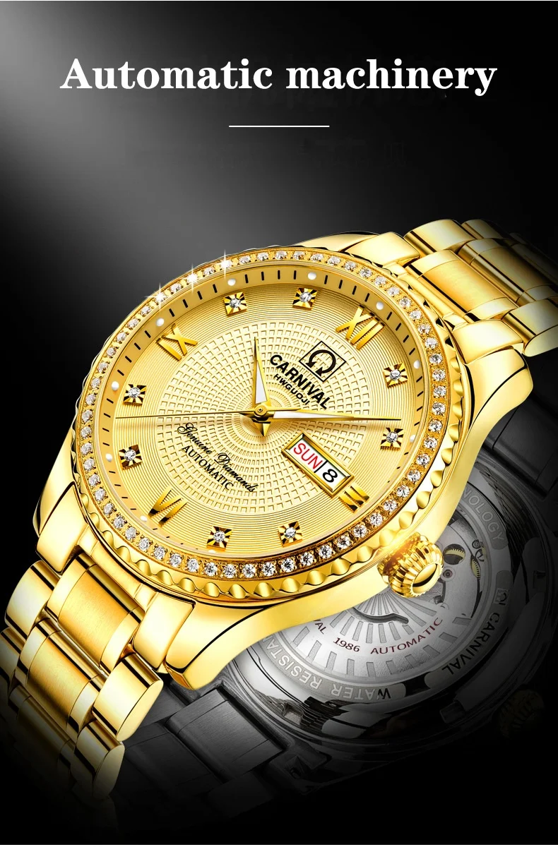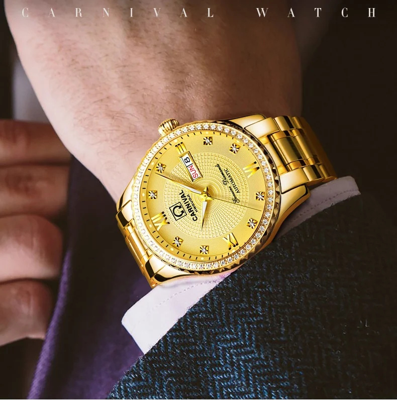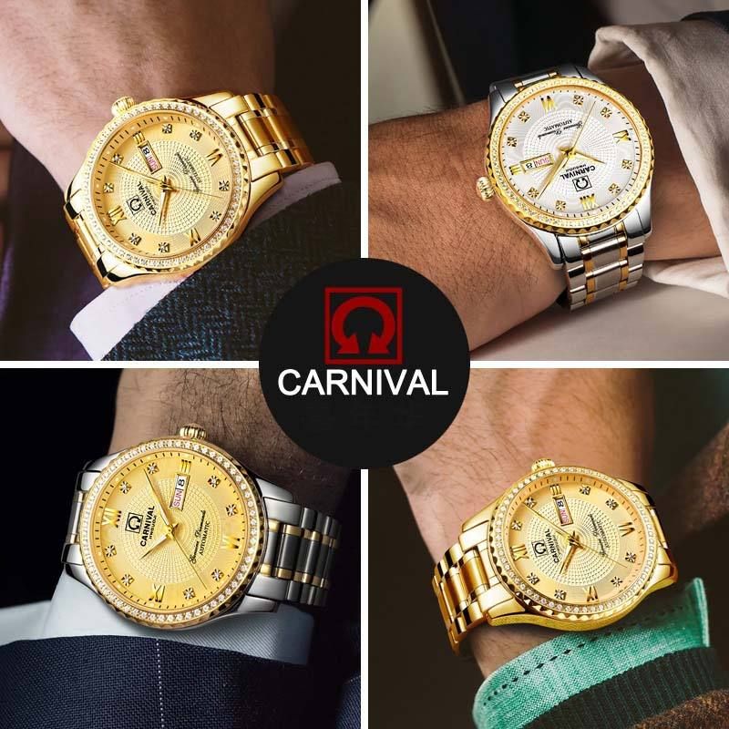 Carnival Luxury Men's 20mm Dial Display Automatic Mechanical Watch New Fashionable Gold Steel Waterproof Casual Stainless Steel