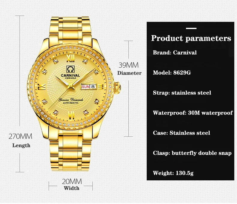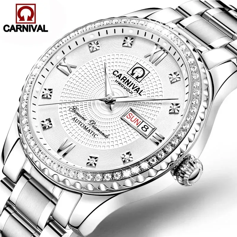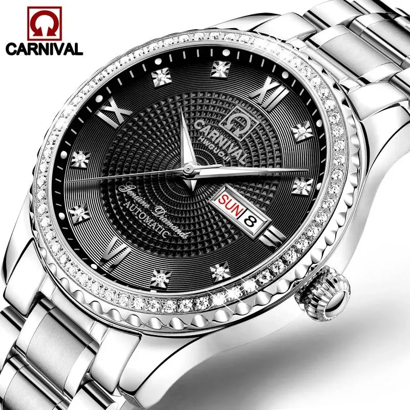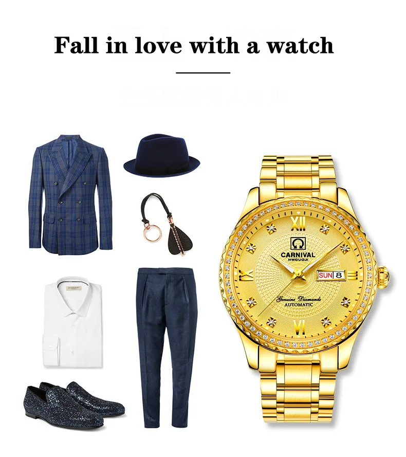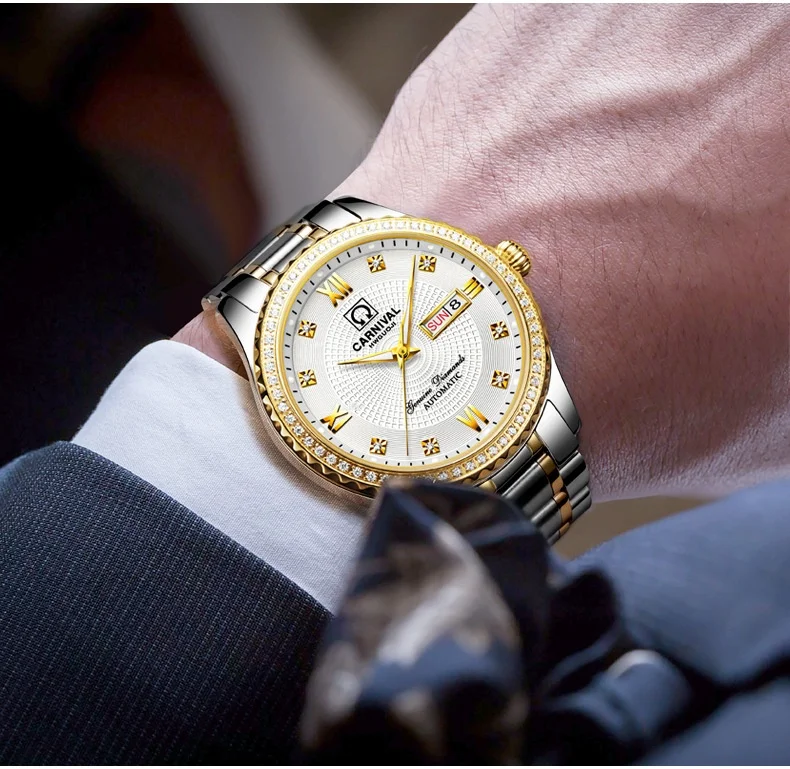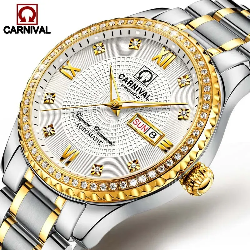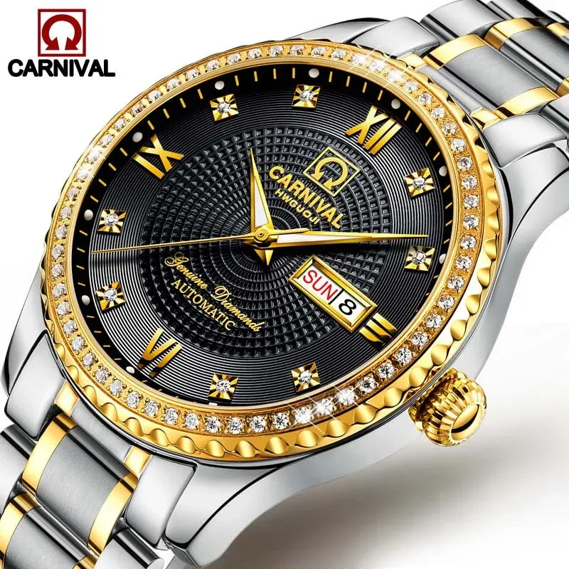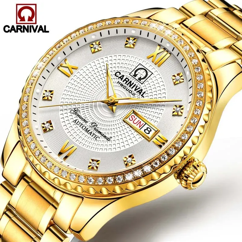 Carnival Luxury Men's 20mm Dial Display Automatic Mechanical Watch New Fashionable Gold Steel Waterproof Casual Stainless Steel